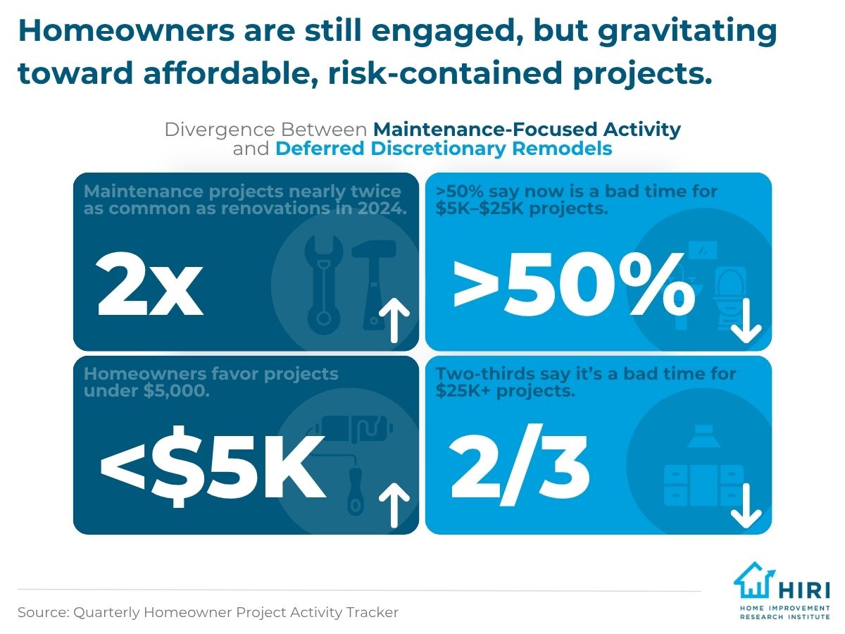 In light of financial strain and cooling optimism, DIY trends reveal that homeowners are focused on essential maintenance and lower-risk projects, underscoring a retreat from discretionary ambition. Throughout 2024, home maintenance including routine tasks and activities to keep a home in good condition, were the most popular types of home improvement projects completed, and nearly twice as popular as home renovations across all four quarters. Budgets, labor costs, and overruns have been reinforcing cost as the central barrier to these shifts in home improvement behaviors. Motivations also center on income gains, economic conditions, and incentives, but affordability is the dominant factor.