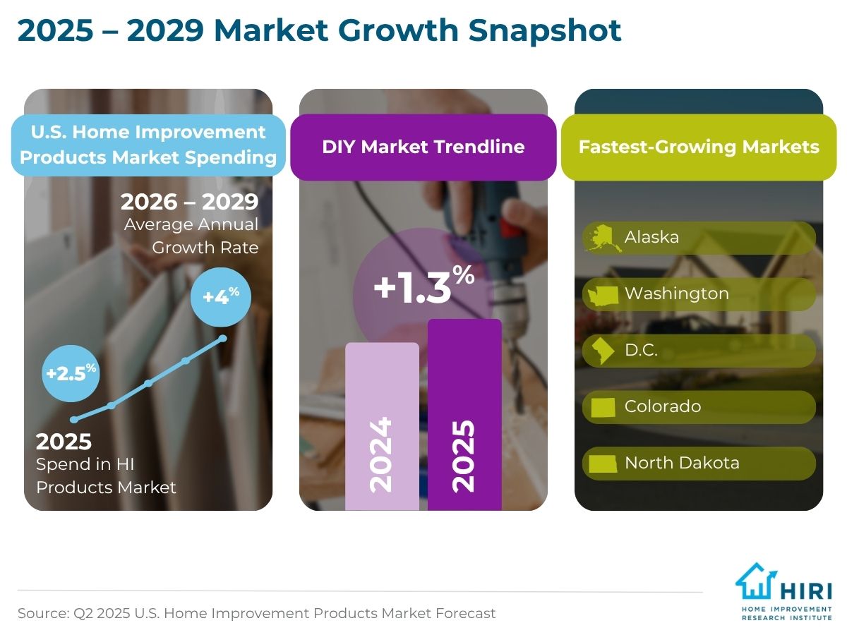 Based on data from HIRI’s Q2 2025 U.S. Home Improvement Products Market Forecast, spending in the home improvement products market is expected to increase 2.5% in 2025, with an average 4% annual growth rate from 2026 – 2029, reaching roughly $688 billion by that year. From a homeowner perspective, the DIY products market saw a modest increase in 2024 and is expected to increase 1.3% in 2025. Growth is projected to be stronger in the consumer market in the upcoming year. The fastest-growing markets for homeowner spending are Alaska, Washington, the District of Columbia, Colorado, and North Dakota.