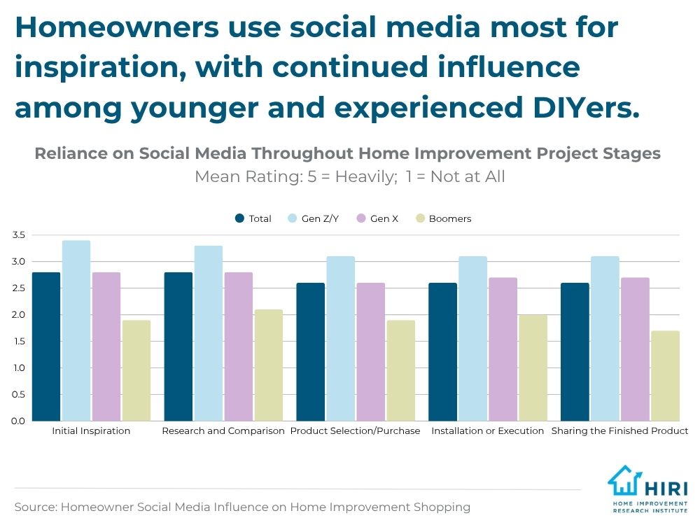 According to data from our 2025 report on Homeowner Social Media Influence on Home Improvement Shopping, sponsored by Miller Brooks, the answer is yes. Social media has the potential to accomplish much more than raising brand awareness when utilized effectively. It can motivate homeowners to start, or accelerate, home improvement projects, and even drive them to make product purchases online. This is specifically true of younger generations, namely Millennials and Gen Z, who are actively participating in online communities and find themselves strongly influenced in terms of ambition, confidence, and project initiation by peers, professionals, and home improvement brands on social media channels.