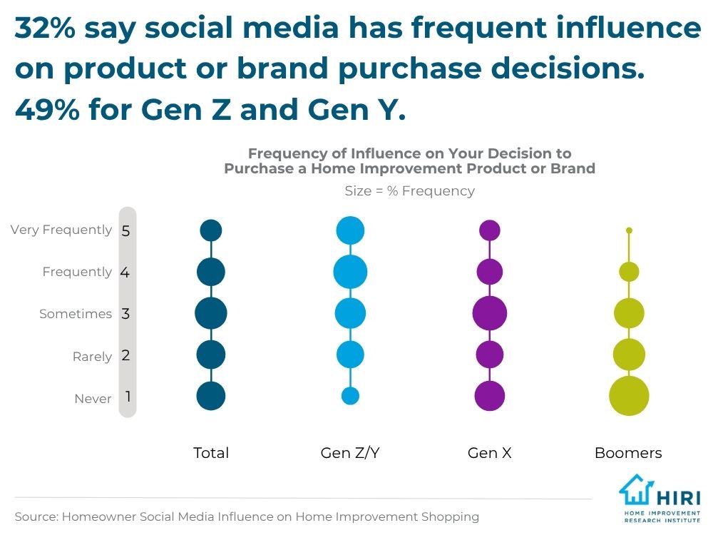 Plus, on average, nearly two projects per year are started or accelerated because of social media content. There is an even higher impact when it comes to the Gen Z/Y demographic: Nearly half say it “frequently” or “very frequently” impacts their purchase decisions.There are some variations, though, with Boomers slower to adapt and less comfortable about the idea of purchasing home improvement products through social media links and shops.