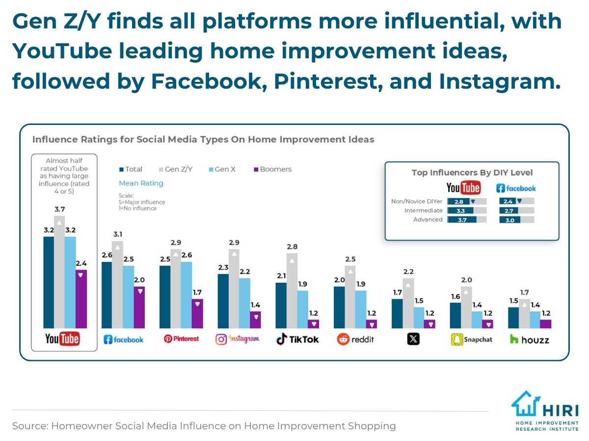 We also see some variations based on experience levels among DIY homeowners. Advanced DIYers are the most likely to act based on something they come across on social media, turning inspiration into real purchases faster than older generations and novice DIYers. Additionally, while a broader group of users get ideas and inspiration from social media, many intermediate and heavy DIYers continue to revisit platforms for guidance throughout the purchase and installation process.