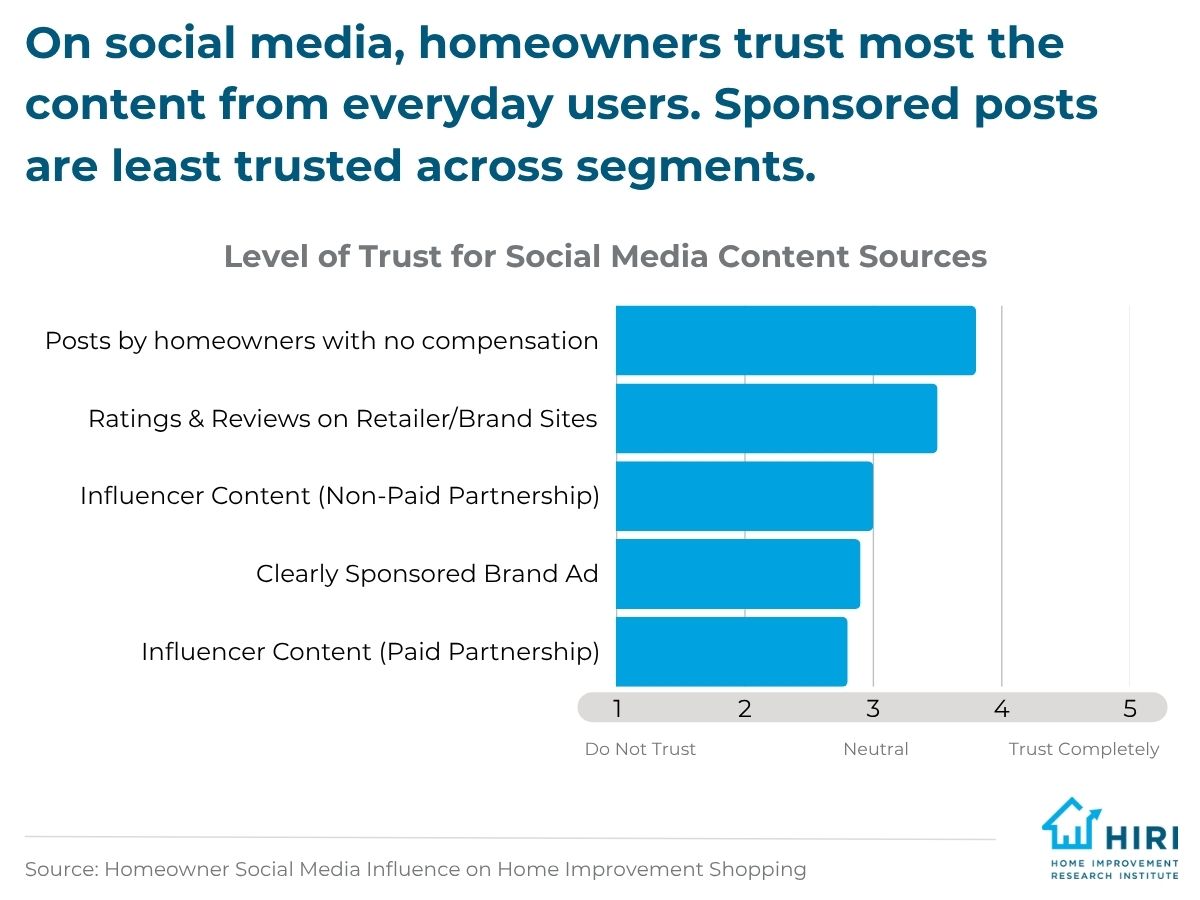 Additionally, our Homeowner E‑Commerce Home Improvement Product Shopping Study, revealed that on social media, homeowners most trust the content from everyday users, or ordinary homeowners who aren’t receiving compensation. Meanwhile, labeled sponsored posts, or influencer content marked as paid or partnered, are considered the least trusted across age demographics. As digital natives, Gen Z/Y users are more skilled at spotting authenticity on social media channels and value a relatable, peer-driven experience.