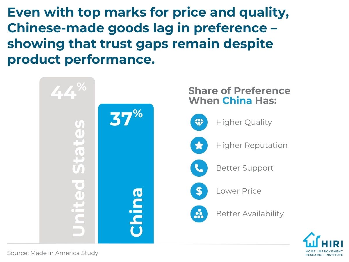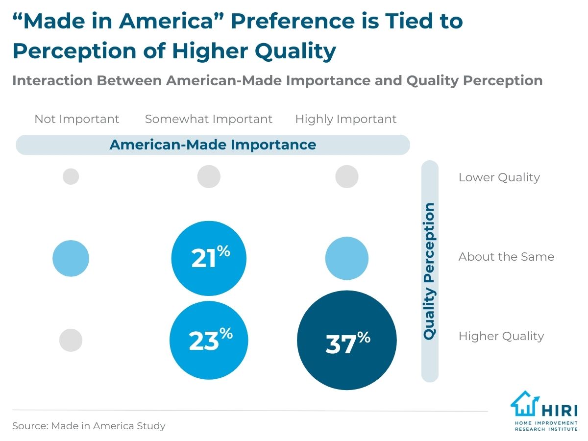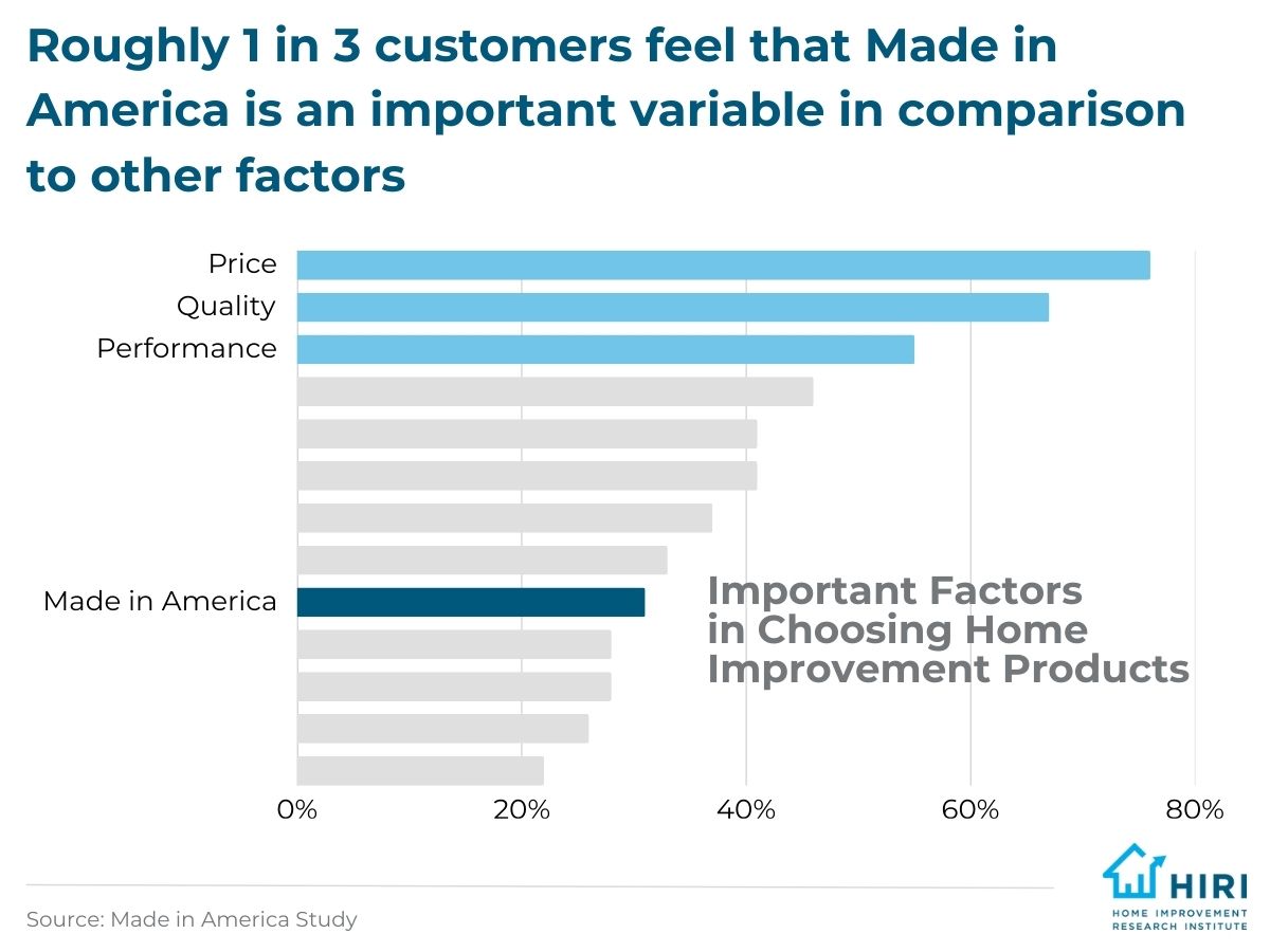 There are several factors that influence homeowners in the United States when comparing and purchasing home improvement products: price, quality, and availability, to name a few. Where the product was manufactured is also an important consideration for many customers.The term “Made in America” carries an array of connotations. For some, it is associated with superior craftsmanship and quality. For others, there’s an ideological pull to make purchases domestically, regardless of how products measure up to their imported counterparts.These perceptions surrounding trust, quality, and brand reputation are shaped by a few key variables, such as age, DIY experience, and, most importantly, political leaning, as demonstrated by data from the Home Improvement Research Institute’s recent Made in America study. We wanted to explore how and why customers value “Made in America” labels when purchasing home improvement products, providing manufacturers, retailers, and marketers with valuable insights into consumer behavior, brand trust, and the evolving significance of domestic production in the home improvement market.
