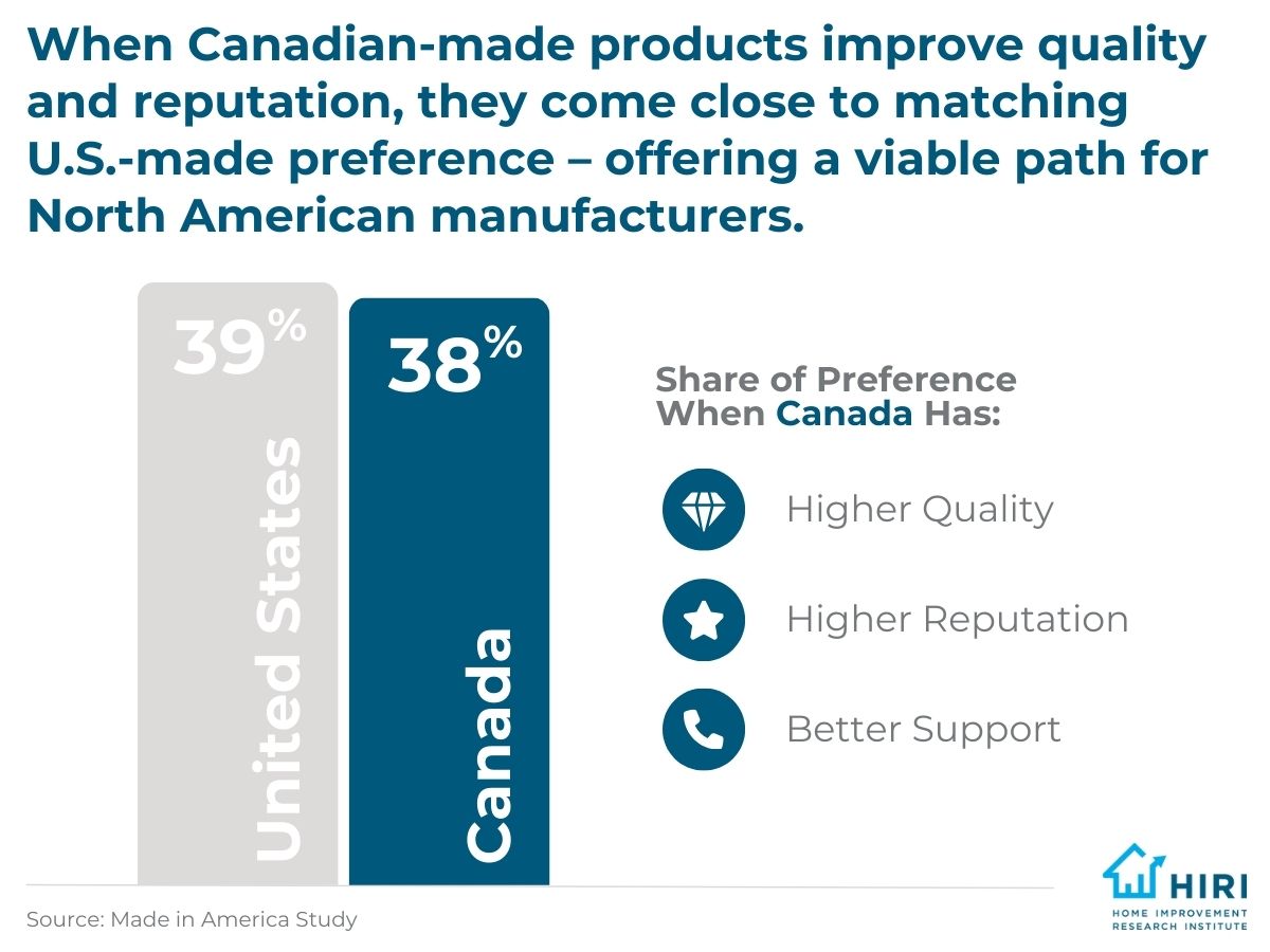 Among certain demographics, Canadian-manufactured products also hold a bias. About 73% of liberals show a preference for home improvement goods manufactured in Canada, compared to 64% of moderates and 57% of conservatives. Additionally, the data in our study offers a realistic competitive roadmap for North American manufacturers, providing insight into how they can close existing preference gaps with American-made products. For example, by enhancing their online reputation and reviews, and improving quality, Canadian manufacturers can narrow the advantage, bringing their product perception nearly even with U.S. goods.