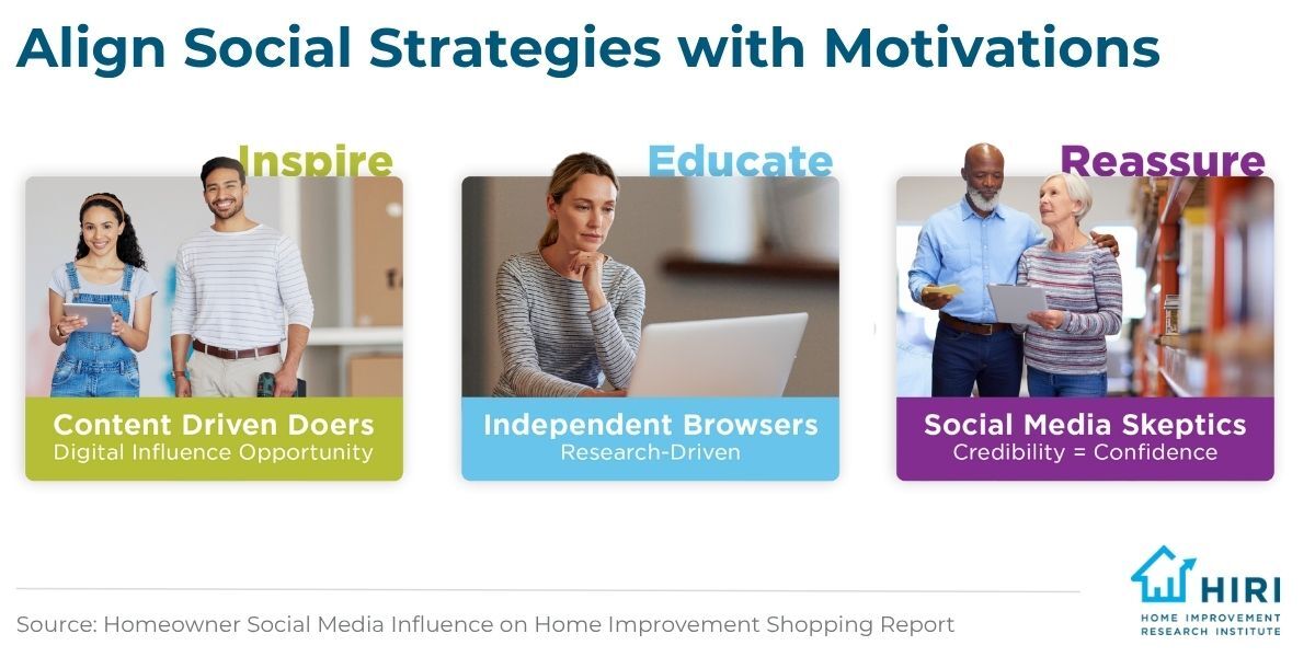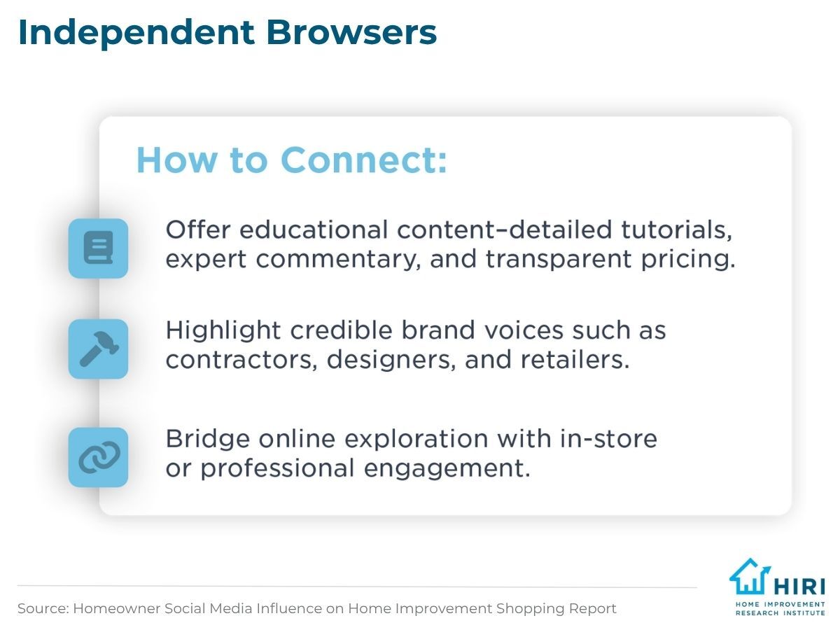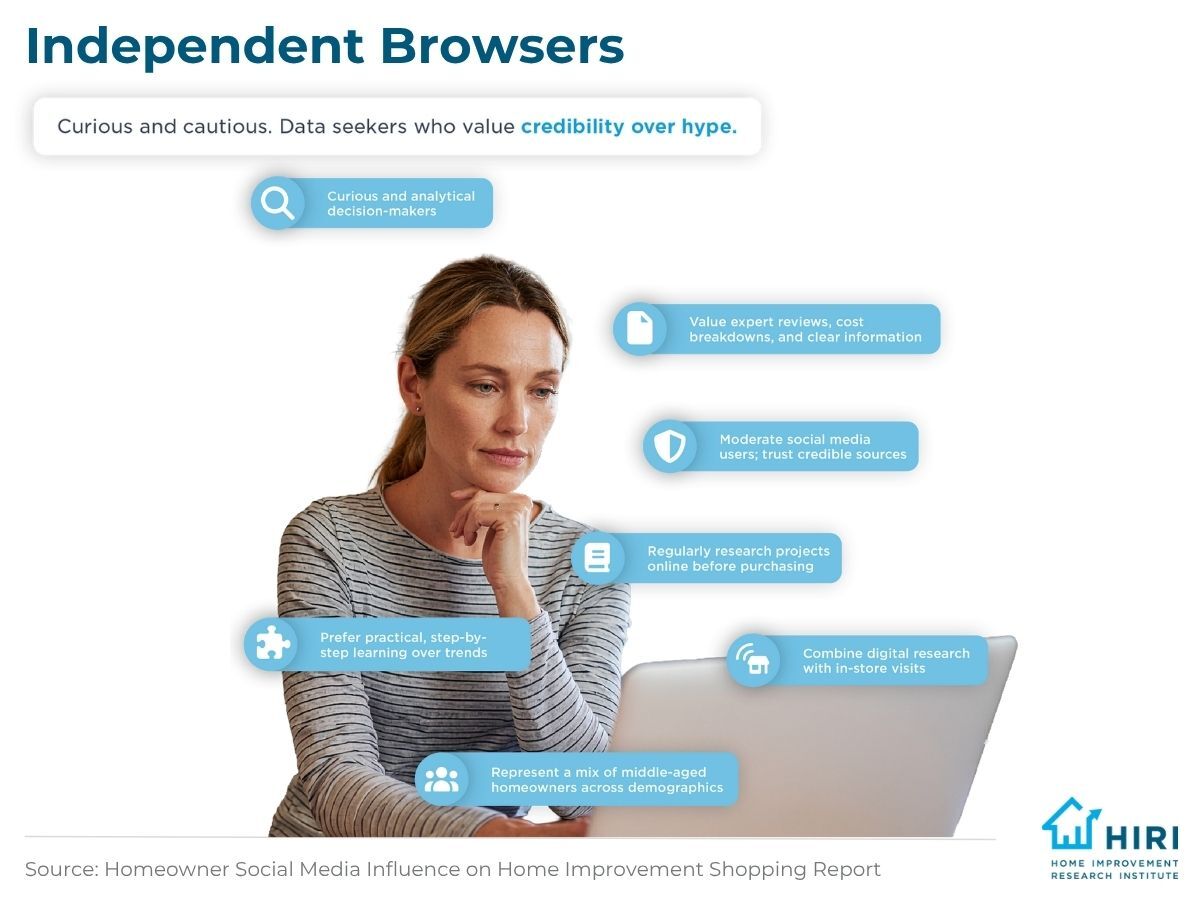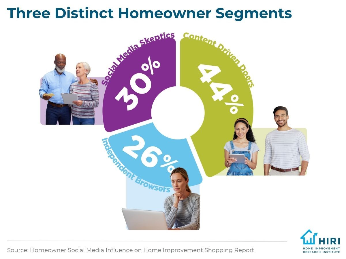 To better understand how social media drives home improvement behavior, HIRI identified three distinct homeowner segments: Content Driven Doers, Independent Browsers, and Social Media Skeptics.