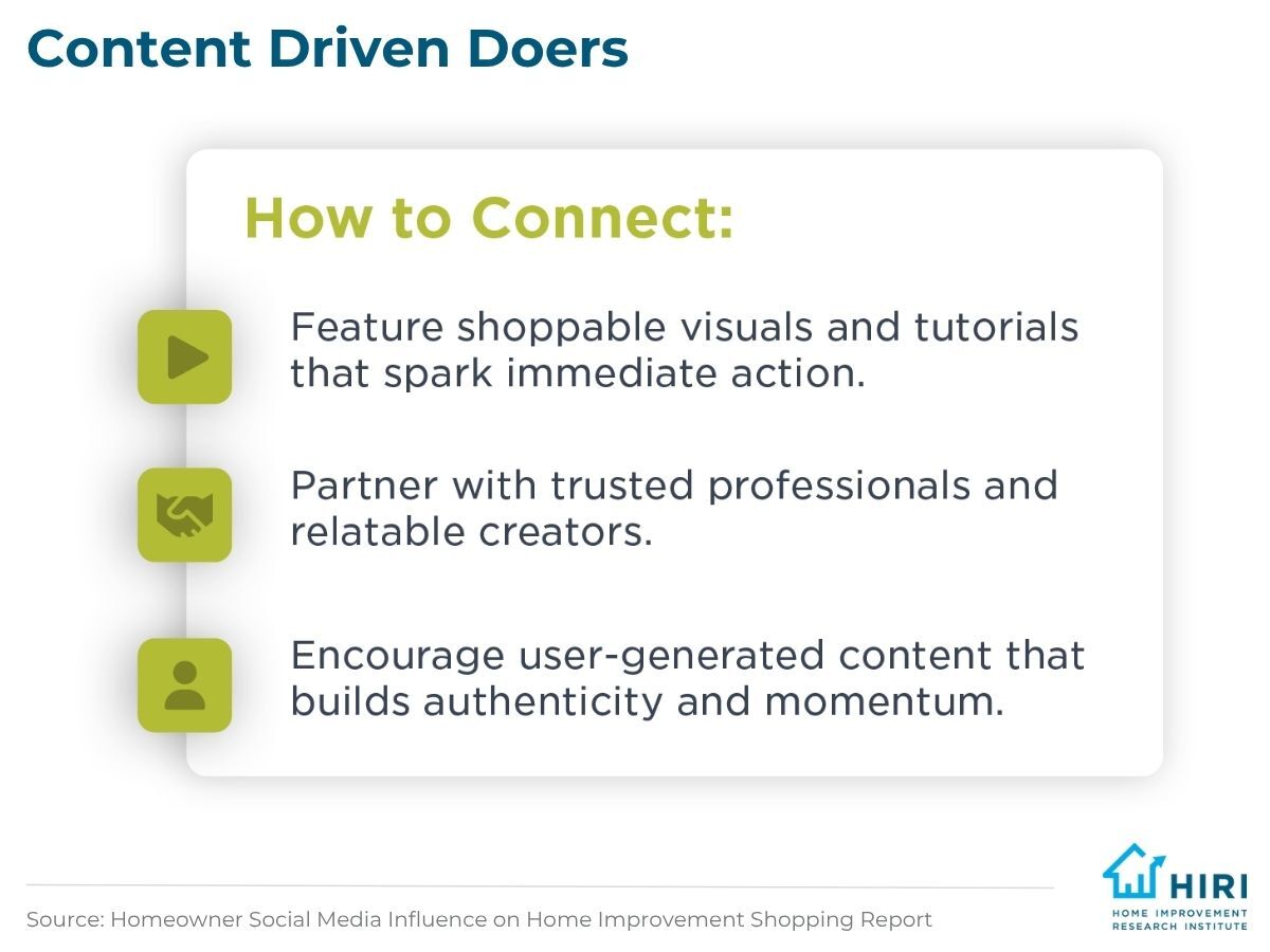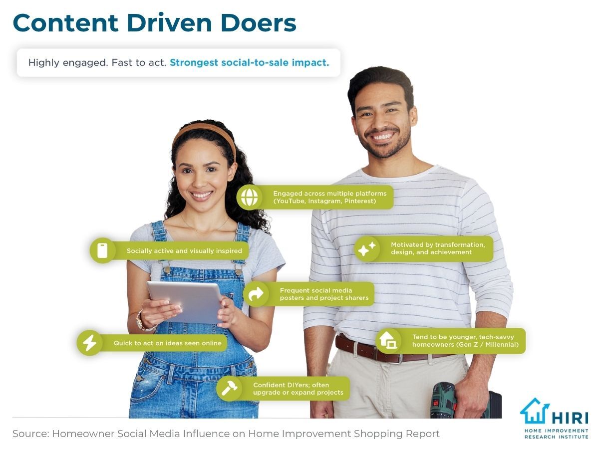Content Driven Doers are today’s most connected homeowners. They use social media daily, share their own projects, and often buy directly from what they see online. For them, platforms like YouTube, Instagram, and Pinterest are both inspiration and instruction—featuring step-by-step videos, before-and-after transformations, and relatable creator tutorials.