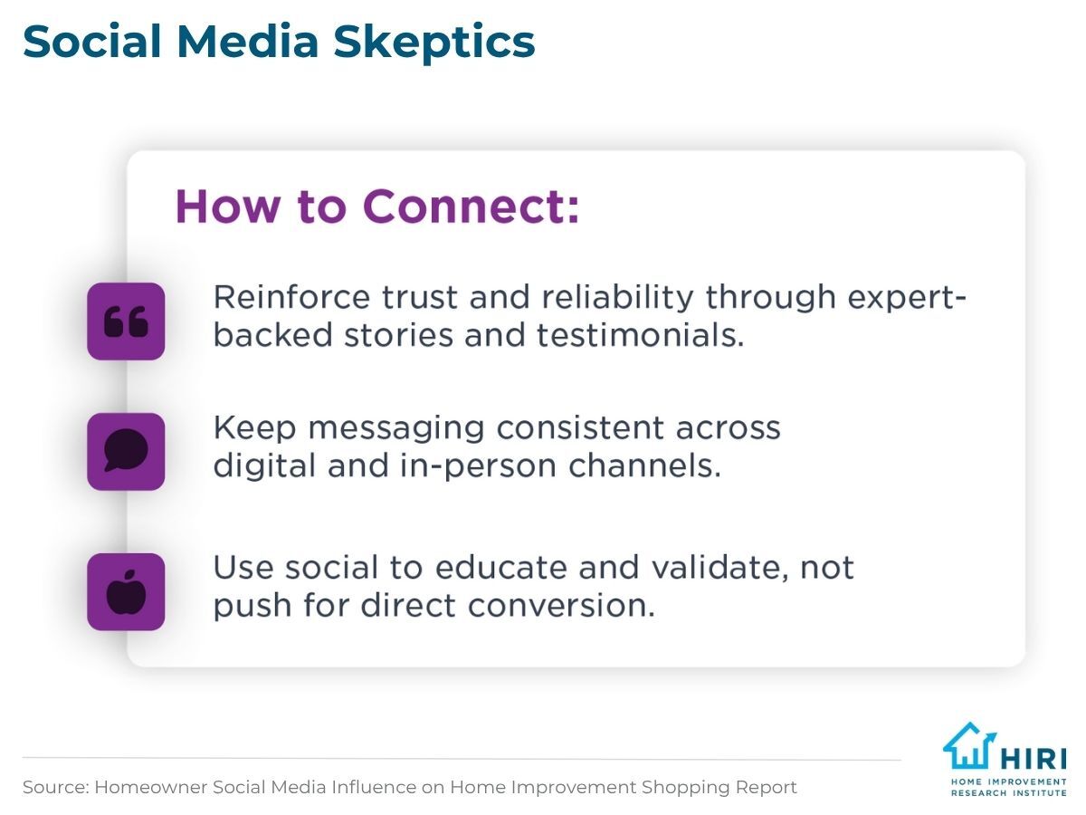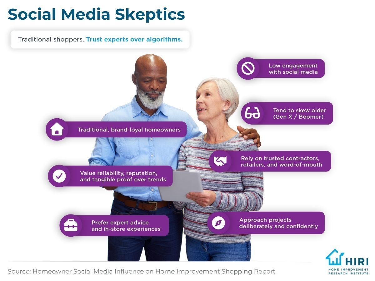 Social Media Skeptics engage with social platforms sparingly and prefer traditional channels for advice and purchases. They trust contractors, retailers, and brand websites more than influencers, and use digital content mainly for reassurance — not persuasion.